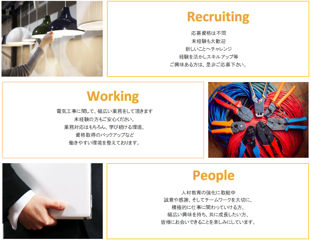 | 雇用形態 | 正社員[電気工事作業員] ※試用期間3ヶ月 |